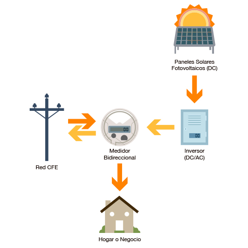 3. La energía eléctrica convertida, pasa por el medidor bidireccional hacia la red de CFE. |